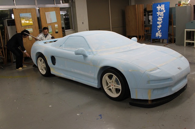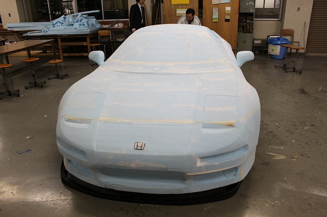 機械デザイン科顧問の海野(うんの)先生指導の下 実車を測定し そのデータを元に 写真等を参考資料に 建築用素材 スタイロホーム(ブルーの発泡スチロール素材)から 手作業による 削り出しで製作されることになりました。