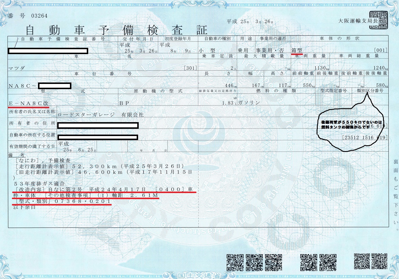 車検証備考欄に 改造内容も記載され 型式番号も 改造認可済みの「改」の字が追加され E-NA8C から E-NA8C改 となっております。