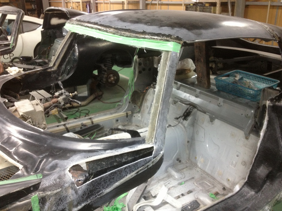 また フロントピラー部分及び ルーフ部分の形状を綺麗に整える為 まず タルガトップから 完全クーペ化する事を優先し タルガトップの先端部とクォーターとの接合部を位置調整してボルト固定し その後 まずは 表面からFRPにて隙間部分及び表面を積層いたしました。