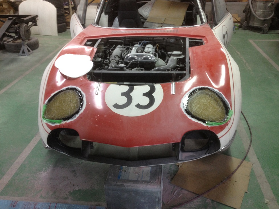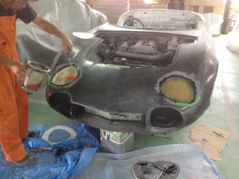地味ながら とても大切な作業ですし この箇所は ヘットライト用の穴が開くため 充分な強度確保の為 ボディーを もともと FRPを8層に積層して補強しておりますので とても手間の掛かる作業です。