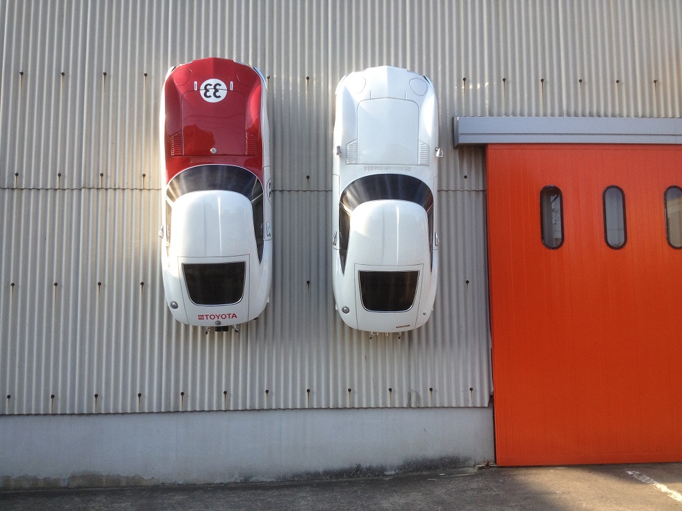 どこを見ても 2000GTの形のものばかりですし 車はもちろん 壁の写真や ショーケースのモデルカーなどは すべて 細谷四方洋 様にサインしていただいたものを展示しておりますし 壁にも 大きく細谷四方洋 様と2000GTの画が書いてあり もちろんサインもいただいておりますし 展示場入り口にも シェルビーレーシングの大きな絵が壁に描いてあり トイレの扉も 男子用はブルーでゼッケン23番 女性用はレッドでゼッケン33番が貼ってあります。