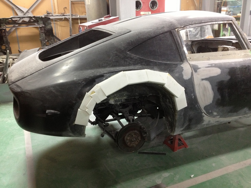 メス型が完成した後は 今回製作しましたウレタンボード製のオーバーフェンダーは もちろん破損してしまいますので 綺麗に撤去し 新たに メス型から製作したオーバーフェンダーを2号車・3号車へ装着し FRP積層で一体化してやれば 綺麗なオーバーフェンダーの完成となります。