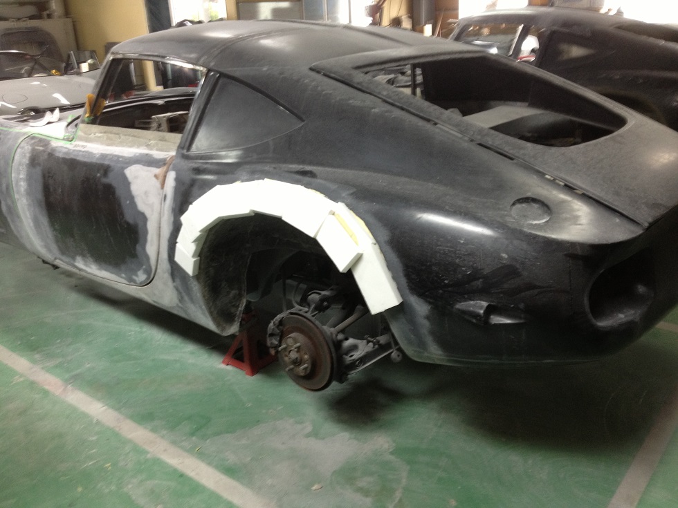 乾燥して充分接着した状態になりましたら 削りだしで オ−バーフェンダーを製作し 最終的にはパテ整形で綺麗に完成させ サフェーサ塗装を施した後 その部分をメス型製作していく予定です。