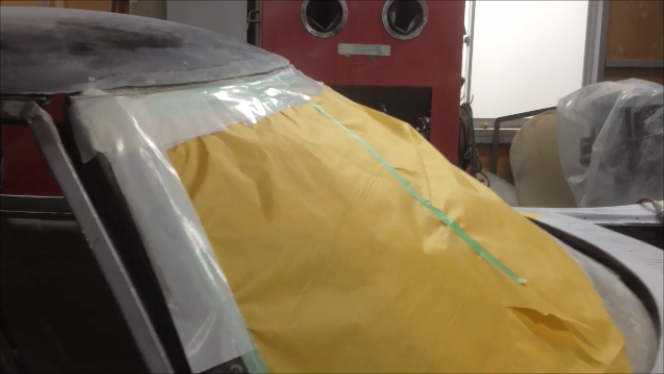 無事カット終了後 コピーガラスでは 多少の変形の可能性も考慮されますので 本物のガラスと交換し ルーフを 下がった上体に固定していきますが 固定は なかなか困難ですので 密着力の強いアルミテープを使用して 外側からしっかり固定させ 形状確認を行った後 インナー部分をFRP積層して 完全密着させております。