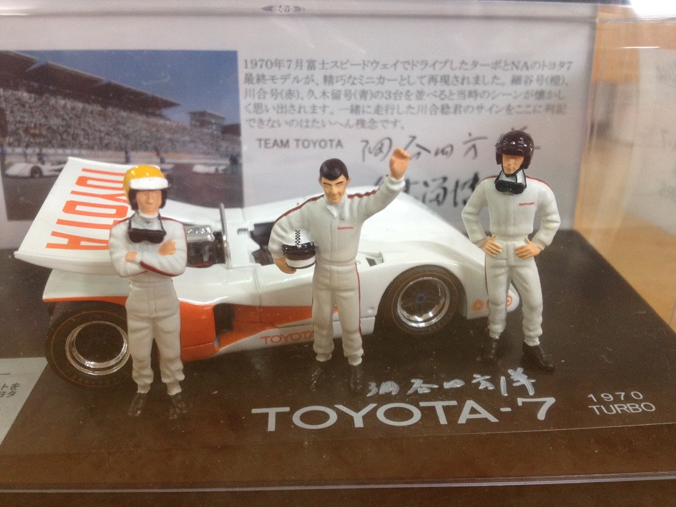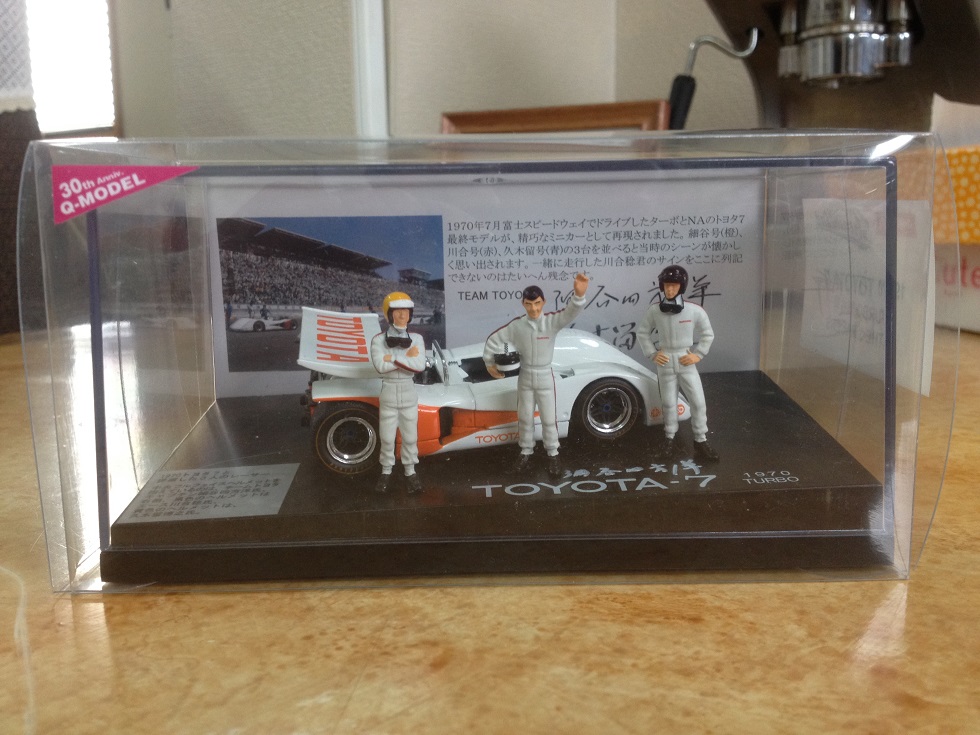 以前から 完成度が高いモデルカーを販売されており やはり 細谷 四方洋 さまが監修されているため 特にスピードトライアルモデルは どのモデルカーよりも良く出来ております「Qモデル」さまが 新作として「トヨタ7とチームトヨタの3名のドライバー様を組み合わせたモデル」を新発売される事になり 同じく このモデルも 細谷 四方洋 さまが監修されているため メーカー様より 2個いただけたとの事で 希少な一個にサインを入れてプレゼントしていただけました。