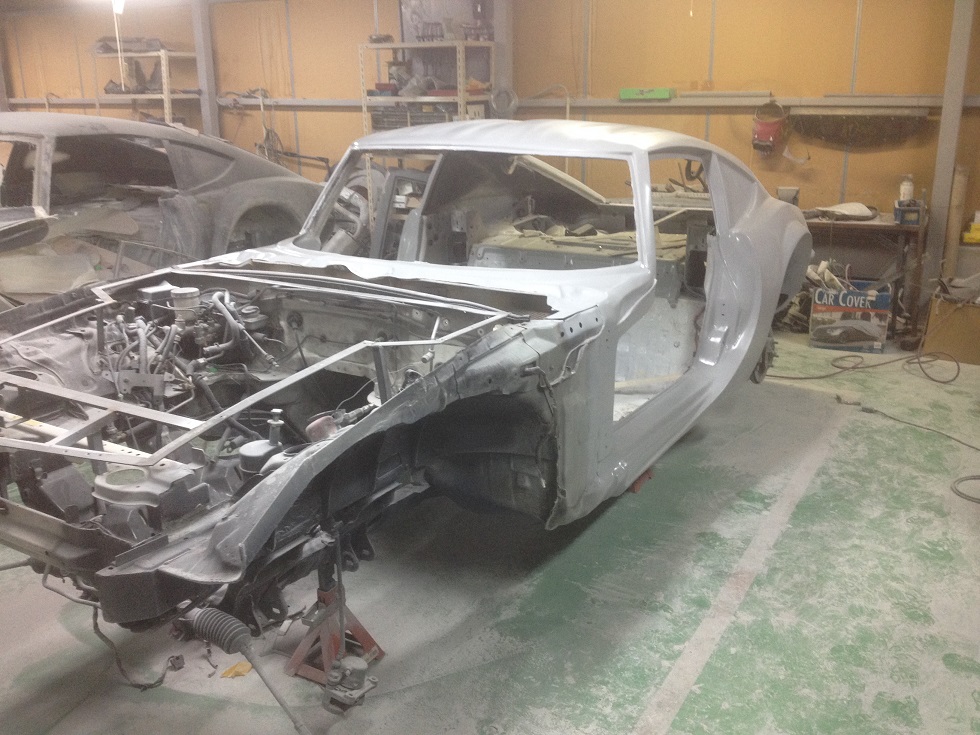 同時進行といたしまして トライアルボディーのフロントピラーおよびロッカーパネルインナーのパテ塗装も乾燥しましたので 丁寧に 最終サンディングを施し 表面のサンディングによる細かい傷処理 および 不良箇所が このままでは見えませんので 確認しやすくするためにサフェーサ塗装を施しております。