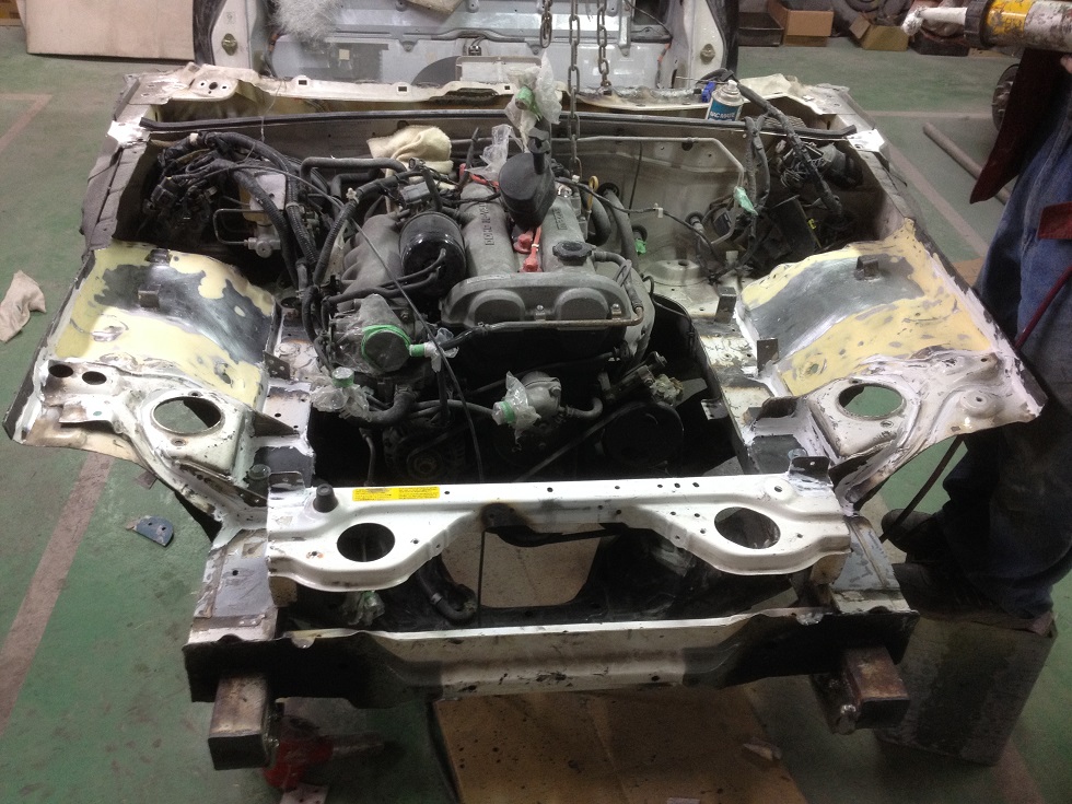 また サス装着部分のサイドフレームにスポット溶接で固定されている部分は サイドフレームを傷つけないように 丁寧にスポットをはがすことで サイドフレームは無傷のまま撤去しており 強度が落ちることがない様に充分配慮して撤去しておりまして また エプロンパネルは強度的に さほど問題ないのですが 固定冶具で位置が変わらないようにして スッキリと撤去し その撤去部分には 亜鉛が混入されている亜鉛鋼板を板金して形を整えながら 一枚の鉄板となるように綺麗に溶接しております もちろん 補強も要れ 強度確保も万全です。