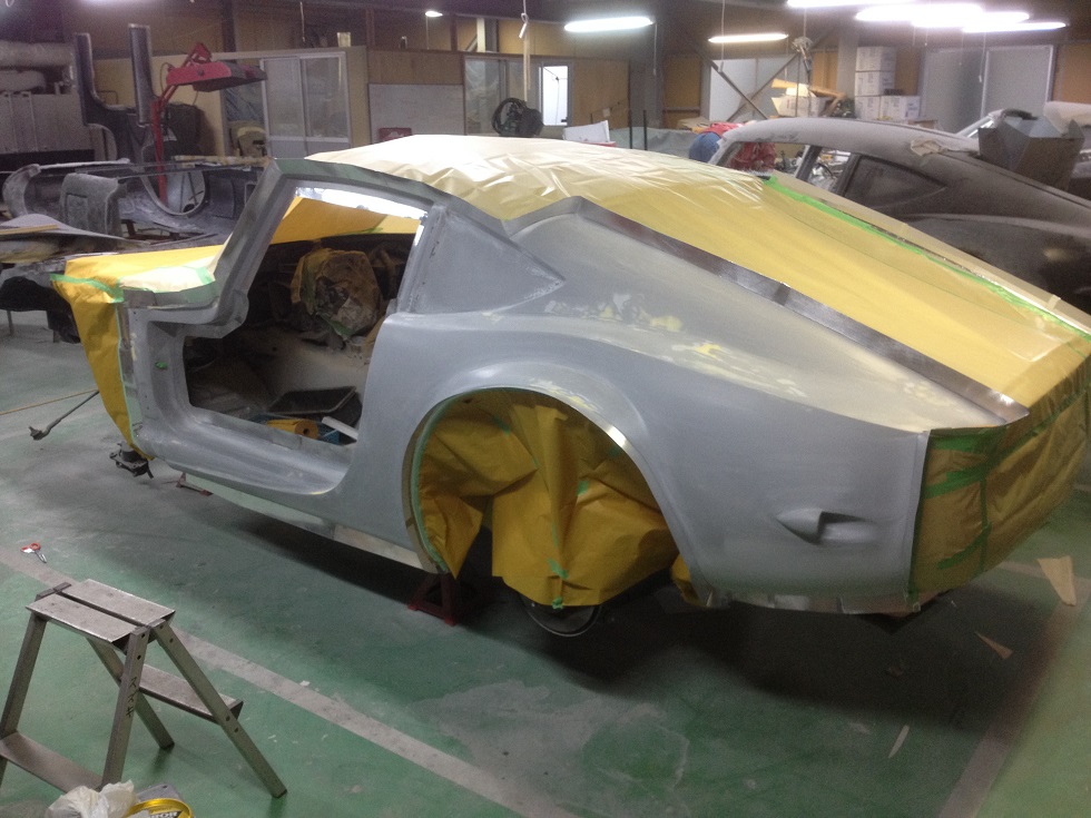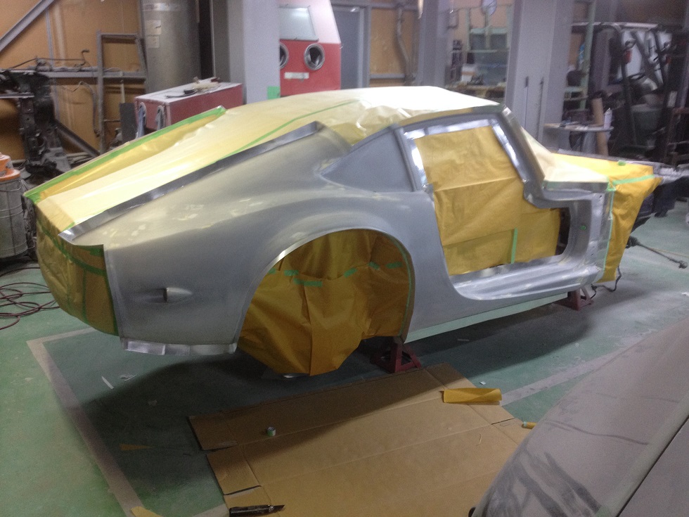 今回は この状態で終了し 全塗装完成の際は どうしても エンジンルームもタイヤハウスもボディーカラーが飛んで付いてしまいますので 最終段階で 外装用のブラック塗装およびクリヤー塗装を施し ピカピカに仕上げることになります。