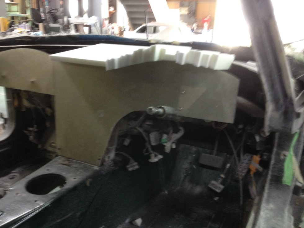 その後 インパネのアッパー部分の製作開始ですが ローズウッド部分の上面が丸くアールしておりますので 2cm厚のウレタンボードを細く切り 上面は 後に 削りだしで整形する為 大きめに出っ張った状態で良いので あくまでもウッドパネルのアール部分に隙間が開かないように何枚も重ねて装着していき 仮固定が完了後 パテを接着剤としてウッドパネルと 先ほど製作しておきました ウィンドー部分との接地面のボードと一体化させました。