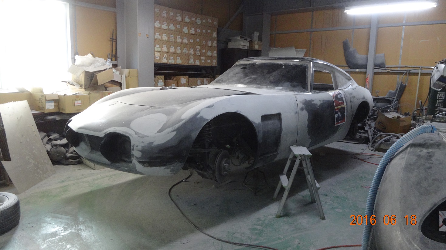 roadster AKI の ボディーは フロントマスク 及び ルーフの 一回目の450番 FRP繊維の積層が 無事完了 強度確保の為 600番 FRP繊維の積層が 2積層完了しております。