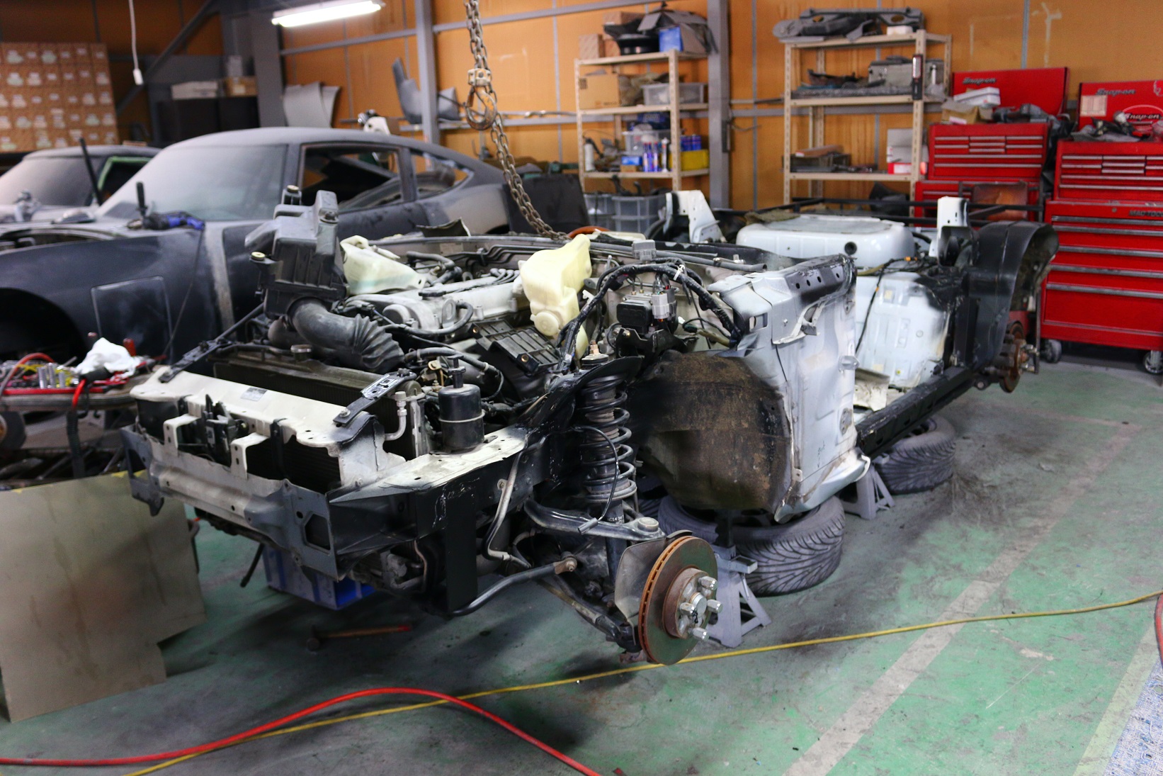 また roadster AKI 2号車のボディー合体が完了 現在 変形防止の為 今週いっぱい メス型に入れたままにしておりますが 来週初め 8日には メス型から離脱 各部のフランジ等を切断した後 直ちに 変形しないように 2号車に合体させたいと思いまして 一号車の 細かい箇所を製作調整しながら まずは 最優先で 2号車のボディー改良を進行させていただき すでに 改良作業が完了 全ての改良箇所に 防錆処理施行 シーラー施行 その後 最後の防錆として 耐チッピング塗装を施して待機しておりますので 8日過ぎには すぐに合体できる状況となっております。
