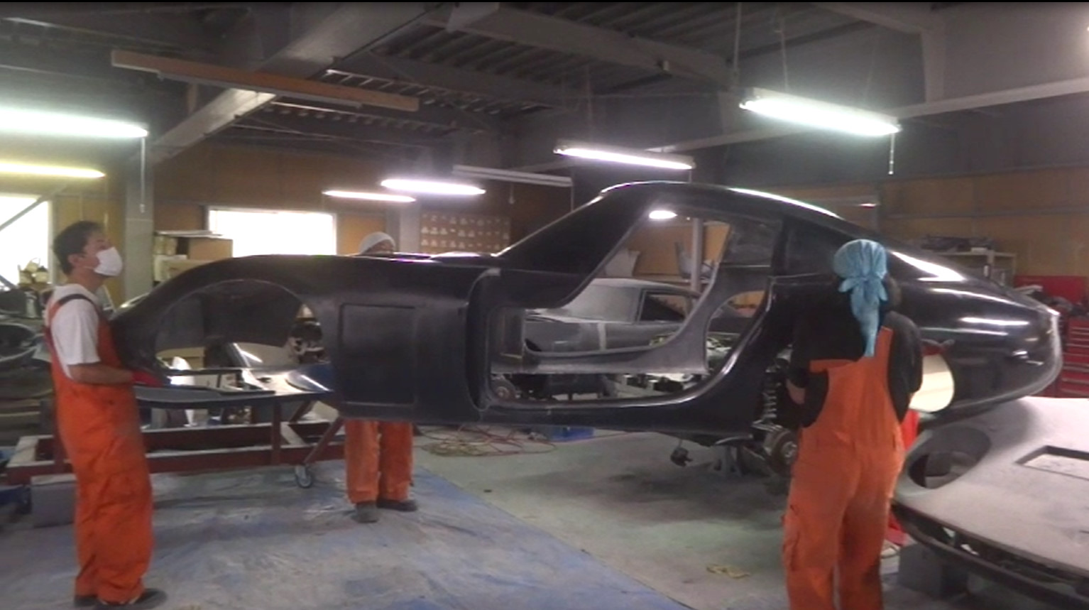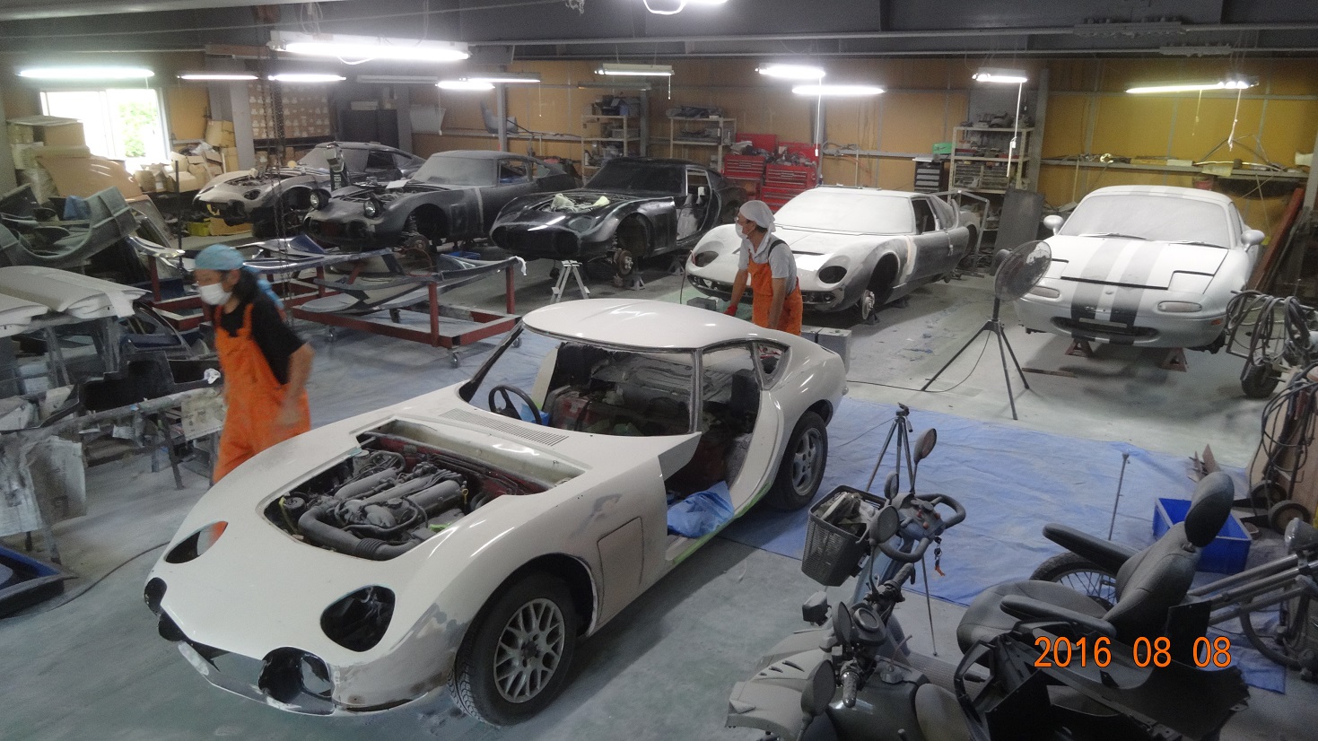 当社の車体は 充分 FRP繊維の積層を 丁寧に 最低5積層 カウルアッパー部分は 7積層 フード周り 及び フロント先端部は 9積層で製作させていただいておりますので 一番 薄い5積層の箇所のカットでさえも FRP専用歯を使用して ジグソーでカットしますが なかなか 切れず 摩擦熱で すぐに 歯が高温になってしまうため 歯を交換しながらのカットは 大変な重労働ですが スタッフ全員で作業し カット後 カット面を サンディングで綺麗に整え 今回は 4人で 車体を持ち上げて 合体させましたので とても スムーズな合体が 可能となりました。