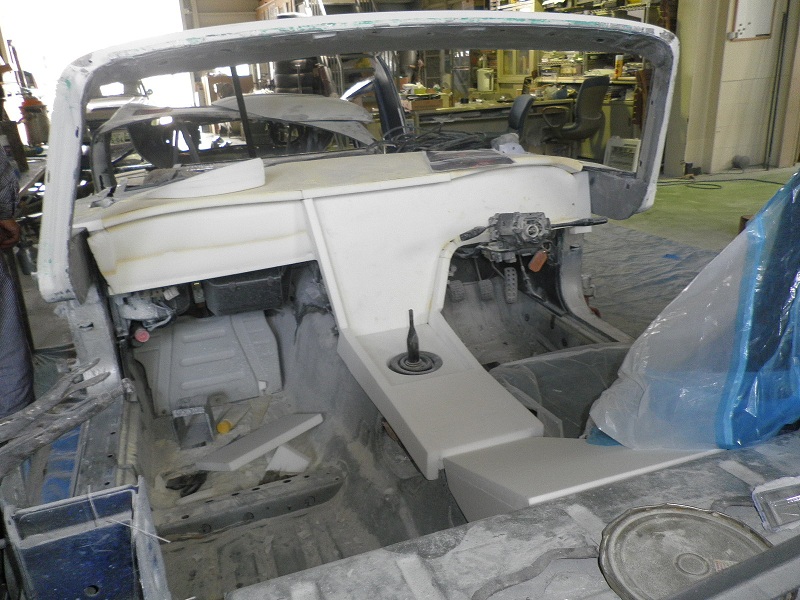 写真をご覧いただけるとわかっていただけると思いますが 現在 ウレタンボードで まずは車体にキッチリ装着できるように だいたいのインストゥルメントパネルの荒型製作を行っているところです。